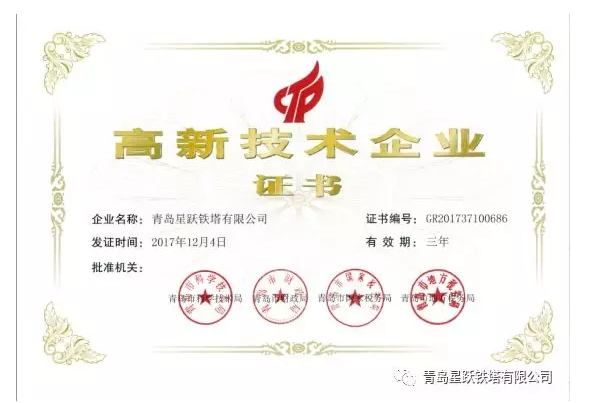 青島星躍鐵塔有限公司于近日收到由青島市科學技術局、青島市財政局、青島市國家稅務局、青島市地方稅務局聯合頒發的《高新技術企業證書》,相關信息如下:
