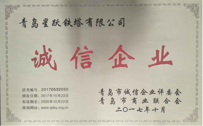 2017年度“青島市誠信企業”評選活動由青島市商業聯合會主辦。經過深入宣傳發動、企業自薦自評、相關部門和行業協會推薦、評委會辦公室初步審核、評委會評審、社會公示等六個評段的工作,青島星躍鐵塔有限公司等60多家企業被評為2017年“青島市誠信企業”。